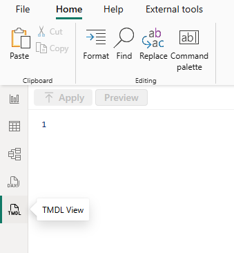 The TMDL View is built into Power BI Desktop alongside your standard Model, Data, and Report views. You'll find it in the view switcher on the left side of the screen.
